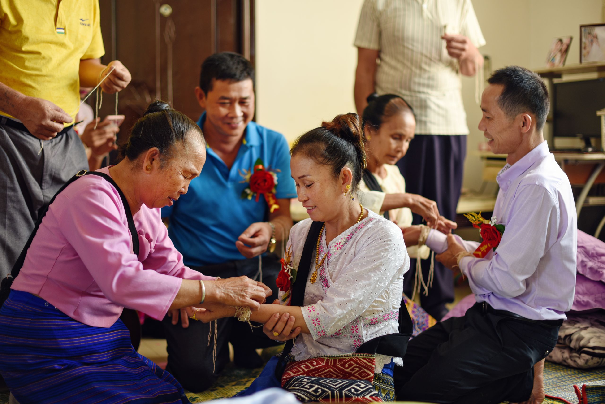 在傣族的婚礼仪式上,有一个拴线的环节。傣族人相信拴线可以系住魂魄,人生中各种重要的时刻都要拴线,既可祝福,亦可消灾。婚礼上,年长的亲人或者乡亲们,把白色的线拴在新人的手腕上,也会给伴郎伴娘拴线,双方父母或者亲人之间都可以相互为对方拴线,传递最亲切诚挚的祝愿。