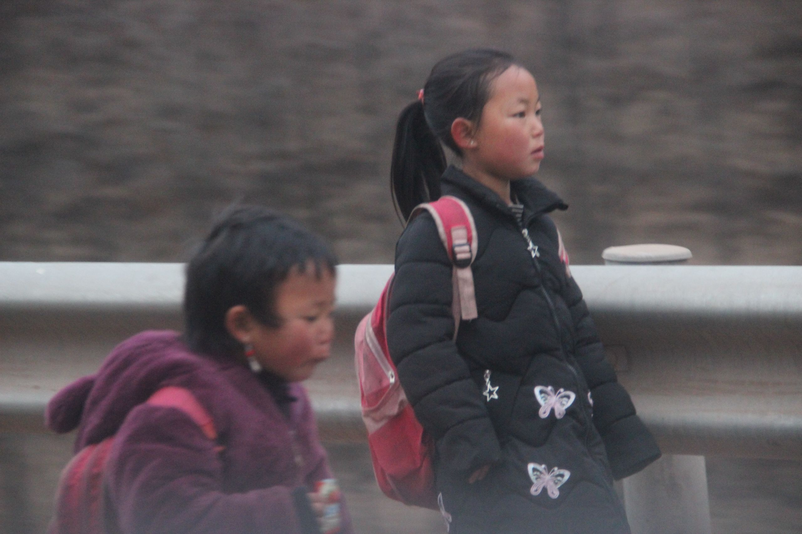 元旦放假后的第一天,沿着公路步行上学的孩子。