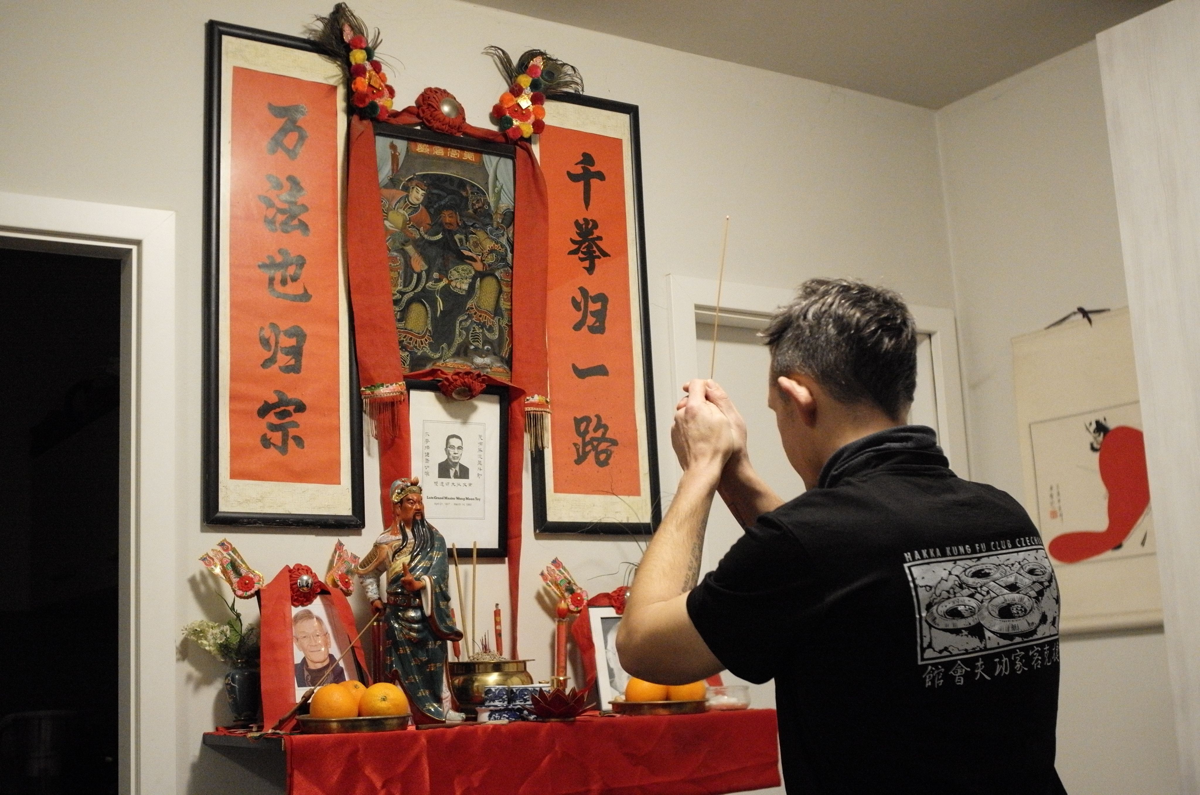 “饮茶,菊普洱。”捷克人Lukáš说罢往莲花茶盘拿出小茶杯给记者倒满,我悻悻接过,感觉看见 Déjà vu——谁想到会在捷克首都布拉格用广东话跟“鬼佬”沟通,喝地道广东茶饮;抿茶时目光扫去右边,红花花的对联写着“千拳归一路,万法也归宗”,关公雕像赫然立在正中央,两旁放着Lukáš挚友George Hušek及其师公的黑白照,相框周围还挂有红花球。