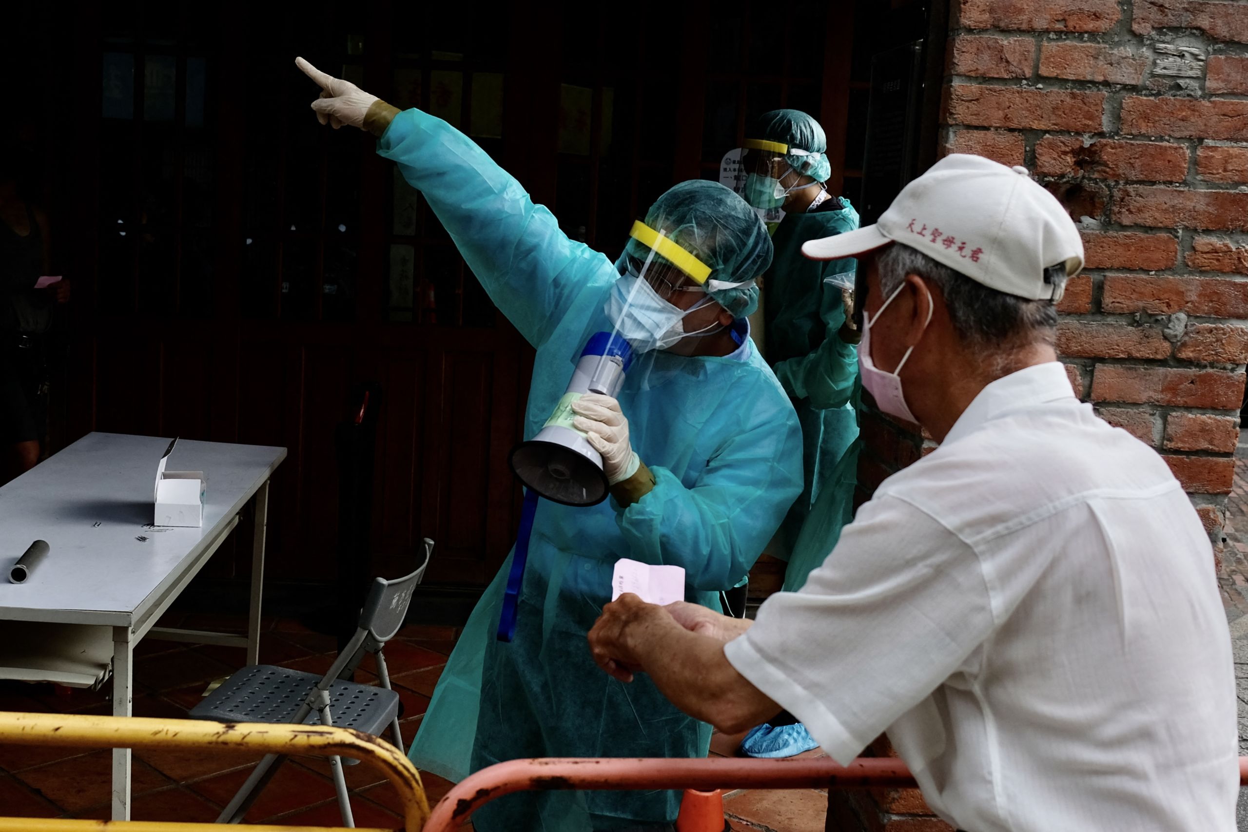 万华区的居民排队等候接受 COVID-19 病毒检测前听取医务人员的讲话(图片来源:AFP)