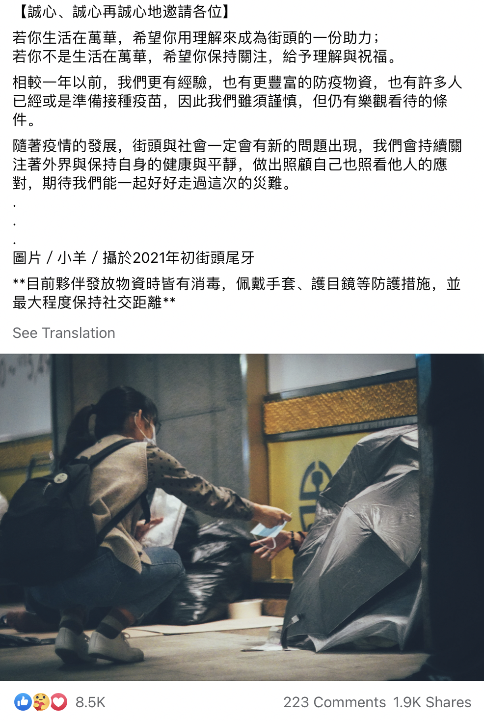 受到污名化的不只有万华的茶室。疫情再度爆发后,长期服务无家者的非营利组织如“人生百味”、“芒草心”,随即联合里长办公室、地方意见领袖等,着手募集、发放物资。然而,媒体、民众对他们及无家者贴标签、猎巫的行为,让他们非常受伤。人生百味 5 月中于脸书发文,希望大家停止对无家者的异样目光。“若你生活在万华,希望你用理解来成为街头的一份助力;若你不是生活在万华,希望你保持关注,给予理解与祝福。”此文引发 8 万多人按赞,近 2 千则转发。