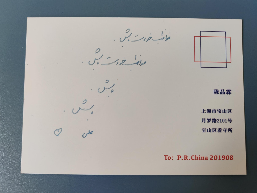 一位伊朗人在放映会后,写下寄给导演陈品霖的明信片。(受访者提供)