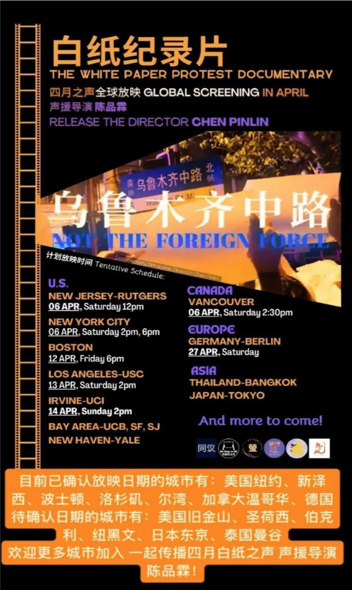 大家迅速地联络起来,并且很快就制作出了统一的海报。“一开始,准备时间很紧张,需要志愿者制作英文字幕,也需要人参与校对,推动各社群敲定第一批放映的时间,也需要制作统一的宣传海报,赶在4月之前发布出来。”Tracy告诉歪脑,选在四月推出全球对《乌鲁木齐中路》的接力放映和声援活动,也是对上海2022年四月开始全面封城,以及随后大家接力转发《四月之声》的一种纪念。
